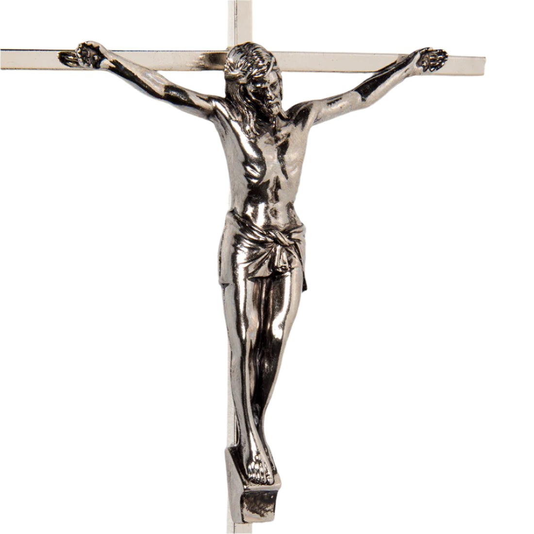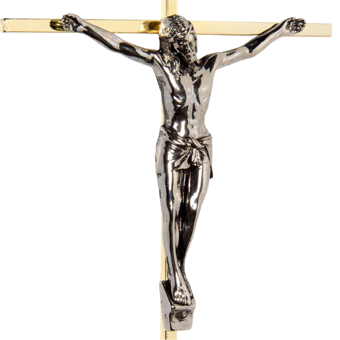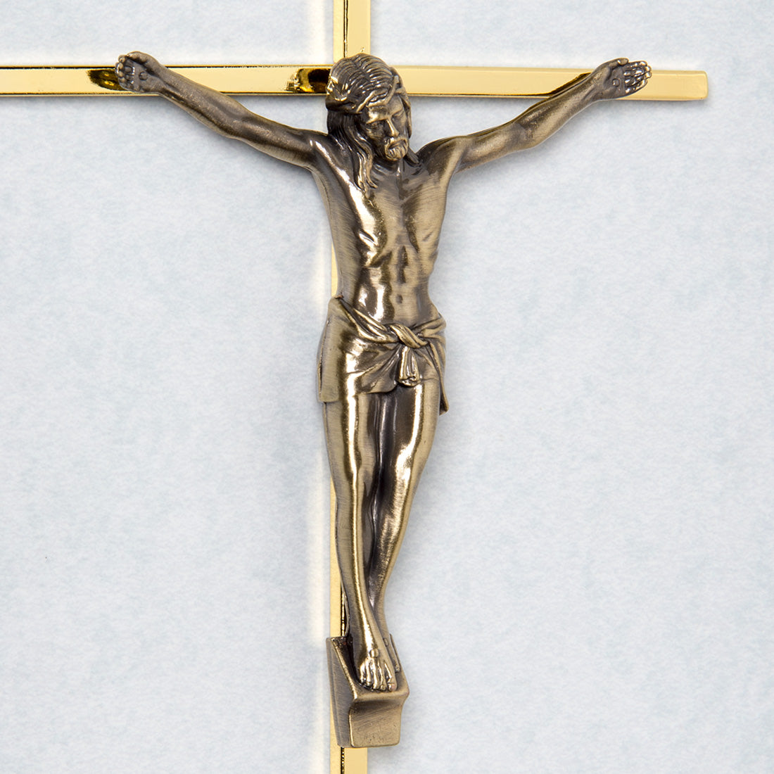 10" Crucifix with Jesus figure. Available in 3 styles. Gold plated brass with antique bronze-tone figure, Nickel plated brass with silver-tone figure, Gold plated brass with silver-tone figure.