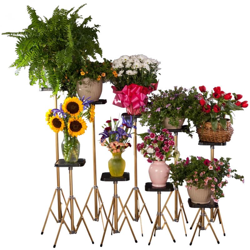 These stands are made with a gold anodized finish and are constructed with durable aluminum tubing. Non-adjustable, they have a time-proven and lasting tripod design. Vinyl feet on the legs give firm footing while protecting floors and carpets. The stands come with a durable 8″ black Melamine plastic top, which is completely interchangeable with the Deluxe Stand.