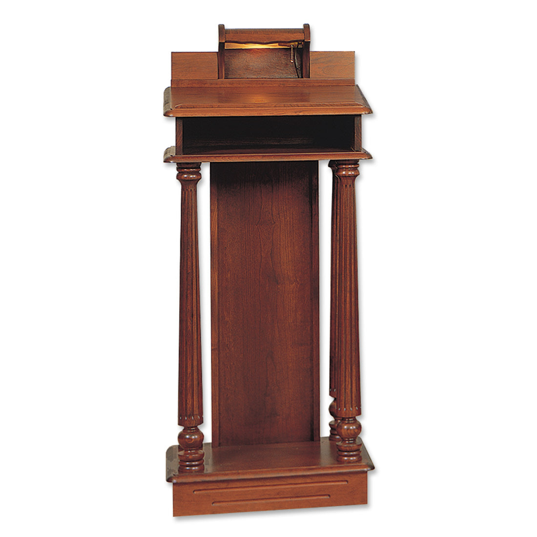 Solid cherry. Features card pockets and shelf. Reflector lamp is all wood with the wiring concealed to come out at the bottom of the base.