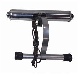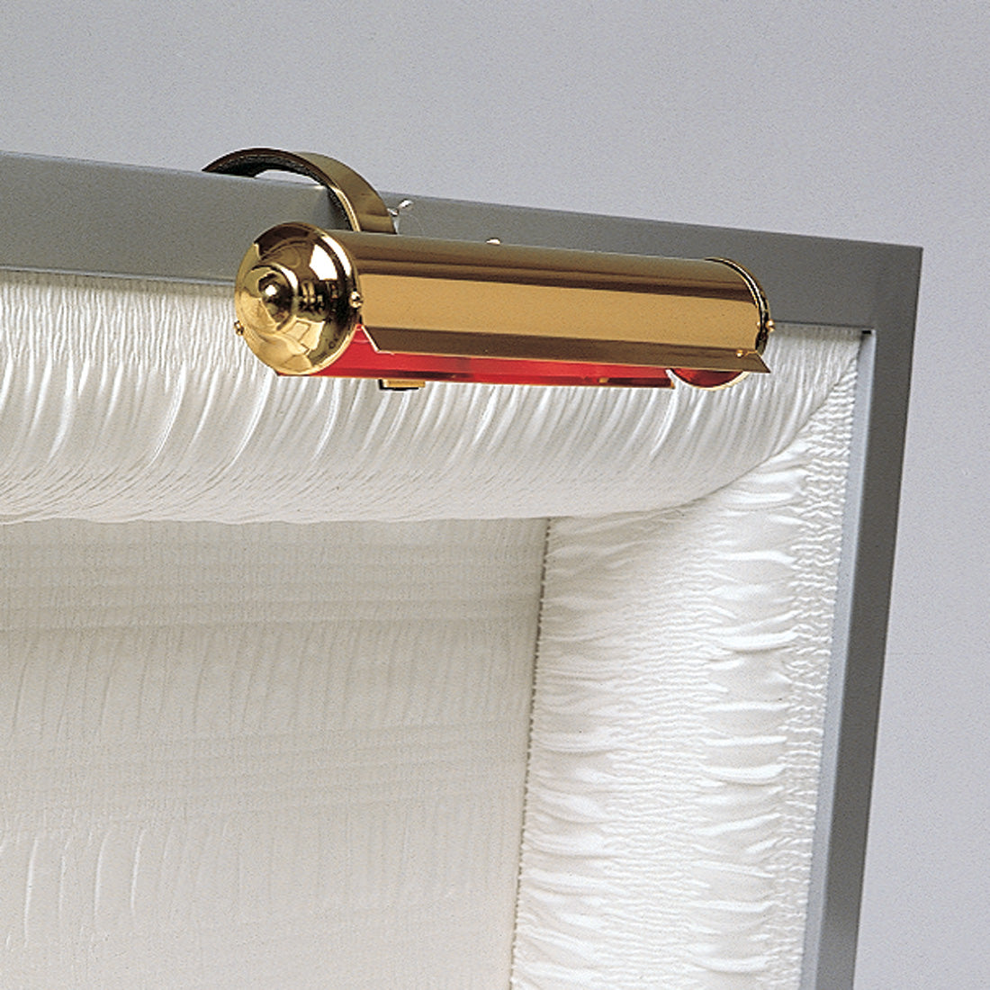 Brass-tone lamp securely loops over the top of the casket lid braced by a balancing bar. Features non-skid edging on the back. Includes a warm-toned magenta bulb.