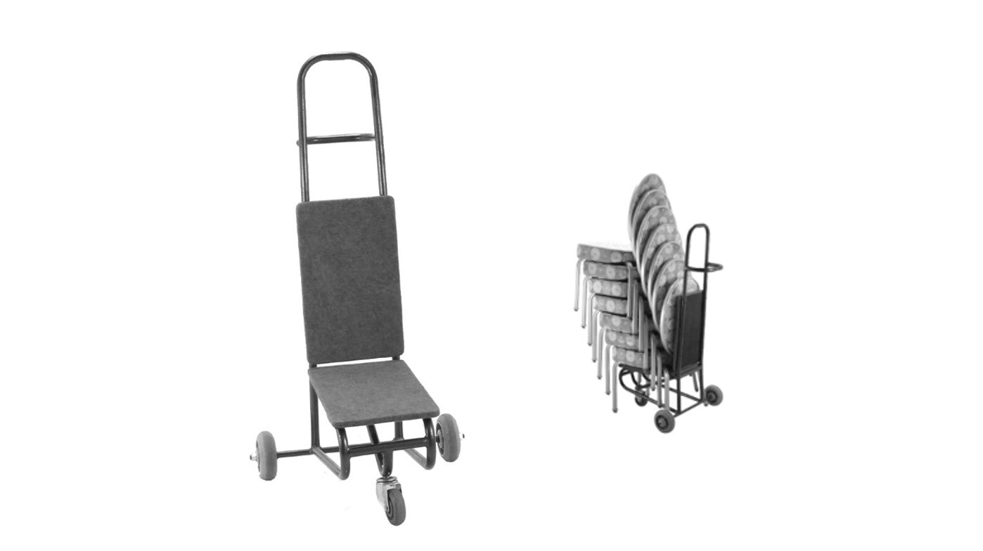 Signature Hand Truck ChapX offers ease of mobility of chapel chairs with this hand truck. The truck features a 3-wheel base with upholstered floor and back to prevent marring of chairs. Easy grip and tilt with a front 365-degree caster for directional movement. Allows for maximum stacking height of 8 to 10 chairs. Made in the USA. This product is made to order and has extra lead-time. Please call to inquire. 26.8"W x 25"D x 49.6"H