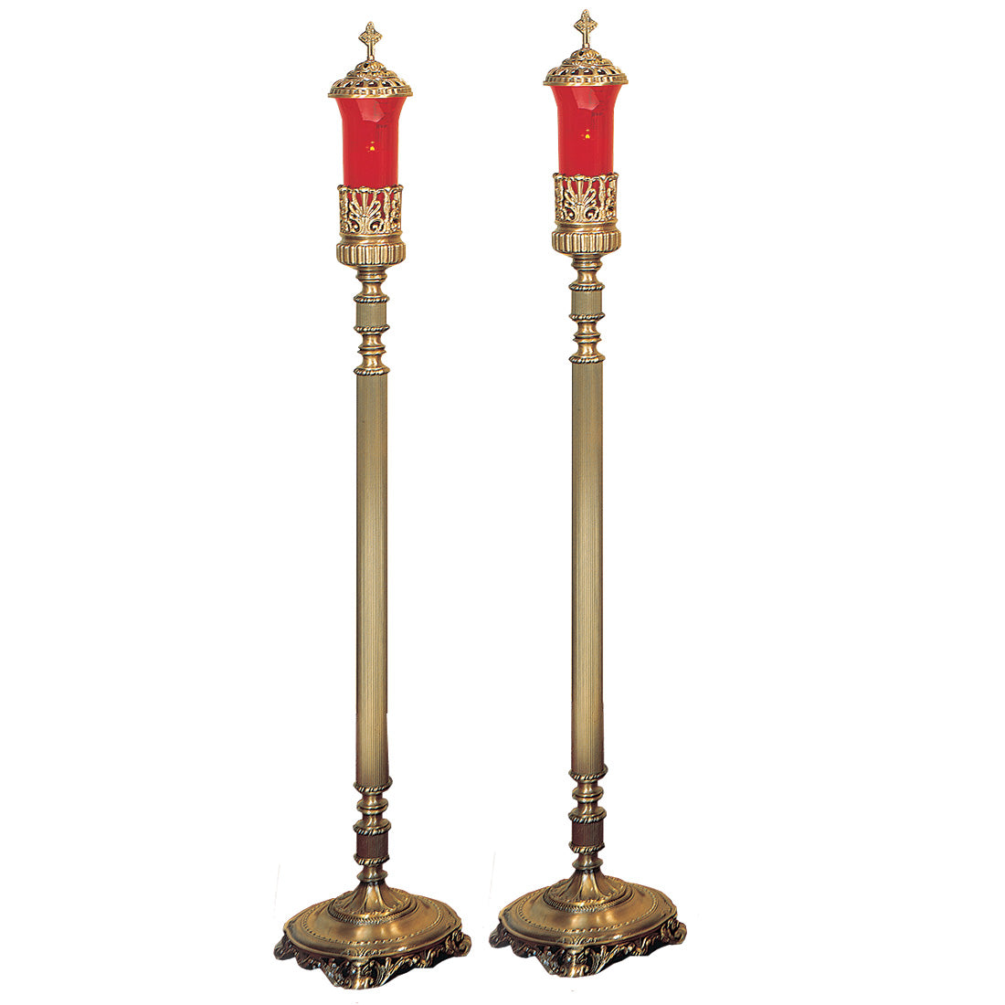 Antique bronze reeded tube design and ornamental base. Feature permanently attached sanctuary lamps with a ventilated cover. 45"H. 1/pr.