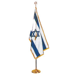 The Deluxe Israel Flag Set includes a flag made of high-quality materials, as well as a two-piece pole with a sleek oak finish, a decorative screw joint, a stand, a pole topper, and a golden yellow cord with tassels. This set is sold as a single unit.