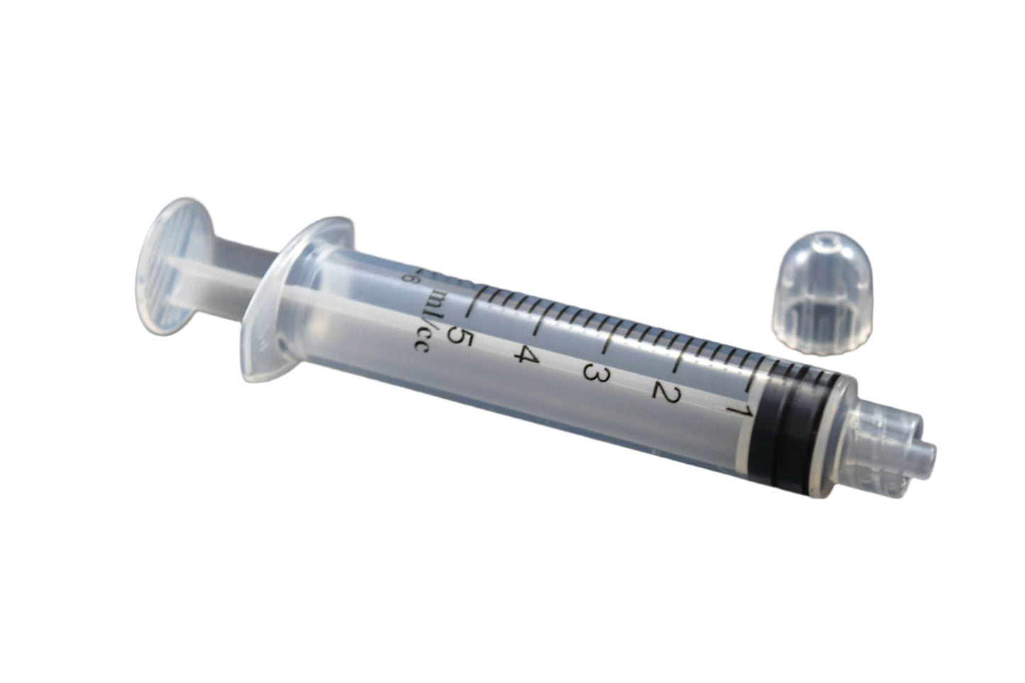 Calibrated in cubic centimeters (cc) or milliliters (ml).