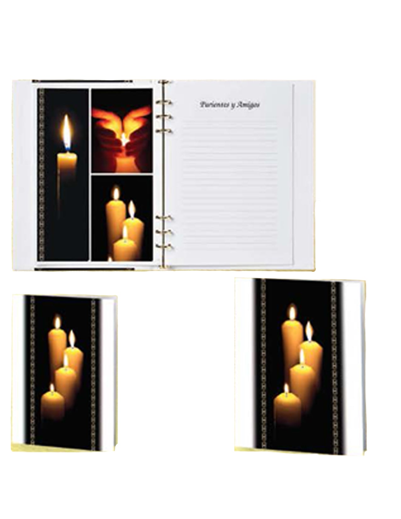 Spanish version. Set features a choice of register book, service records, acknowledgment cards and prayer cards. Deluxe Register Book has a wrap around watercolor cover. The jumbo service records has an inside sentiment that reads the "23 Psalm" in Spanish. The acknowledgment card has an inside sentiment of "The family of...".