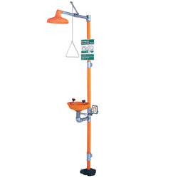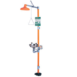 Fully OSHA compliant plumbed device. Includes ANSI-compliant identification sign. Constructed from hot-dipped galvanized steel with cast aluminum floor flange. Water supply is 1-1/4" female top or side inlet, waste is 1-1/4" female outlet. Shower head is ABS plastic. Shower valve is stay-open bail valve with stainless steel actuating arm and stainless steel pull rod, outlet head assembly is two spray heads mounted on chrome plated brass supply arms. Bowl is either 11-1/2" stainless steel or safety orange ABS plastic, eye wash valve is stay-open wall valve with epoxy-coated cast aluminum flag handle. Includes complete assembly and installation instructions. Overall height is 7-1/2’. 1/ea.