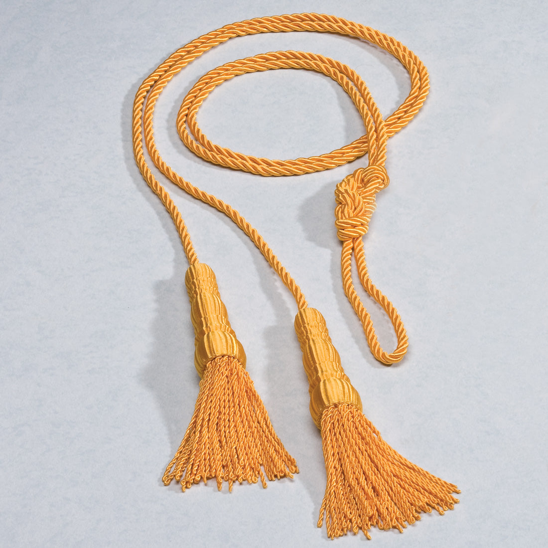Two gold colored tassels connected by a twisted cord. 1/ea.