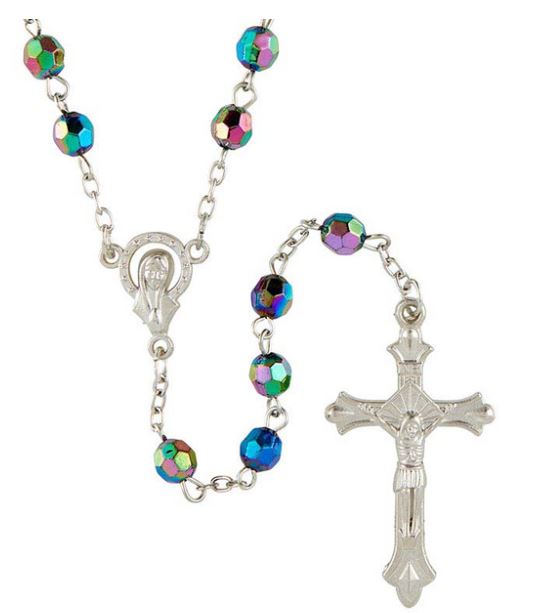 Elegant and timeless, the Aurora Borealis Bead Rosary offers a graceful symbol of prayer and remembrance. Each rosary is strung with 6 mm round glass beads, enhanced with an iridescent aurora borealis finish that gently catches the light—bringing a soft, spiritual glow to every moment of reflection.