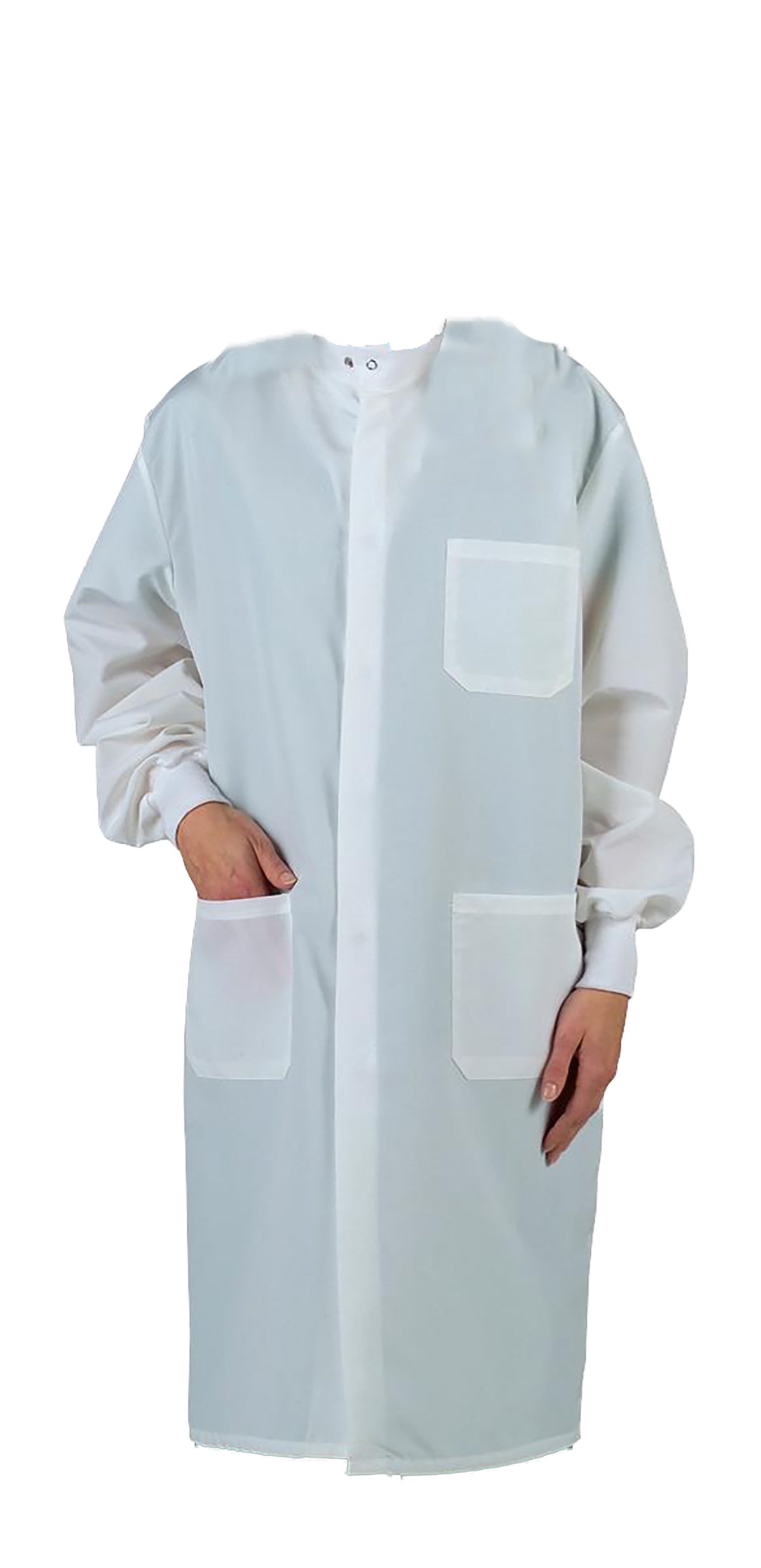 Front and sleeves are ASEP Barrier fabric, back is color matched non-barrier polyester/cotton fabric. Concealed flap snap closure provides greater fluid protection; overlapping stand up collar with snap closure can be worn open or closed; left breast pocket, two lower patch pockets, side-slash openings to access pants pockets. 100% polyester knit cuffs; single vent; average length 44". Sizes XS, S, M, L, XL, 2XL, 3XL.