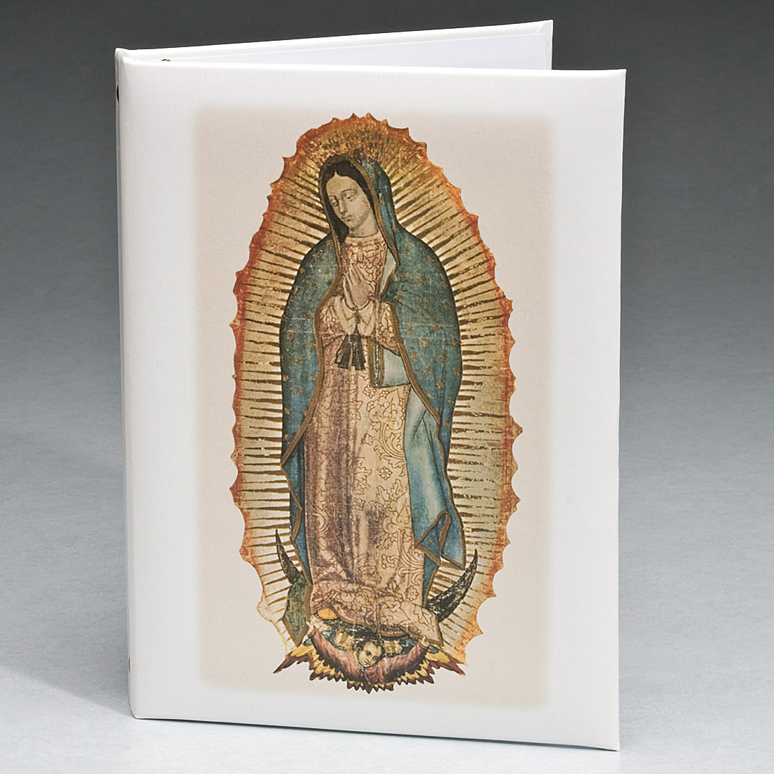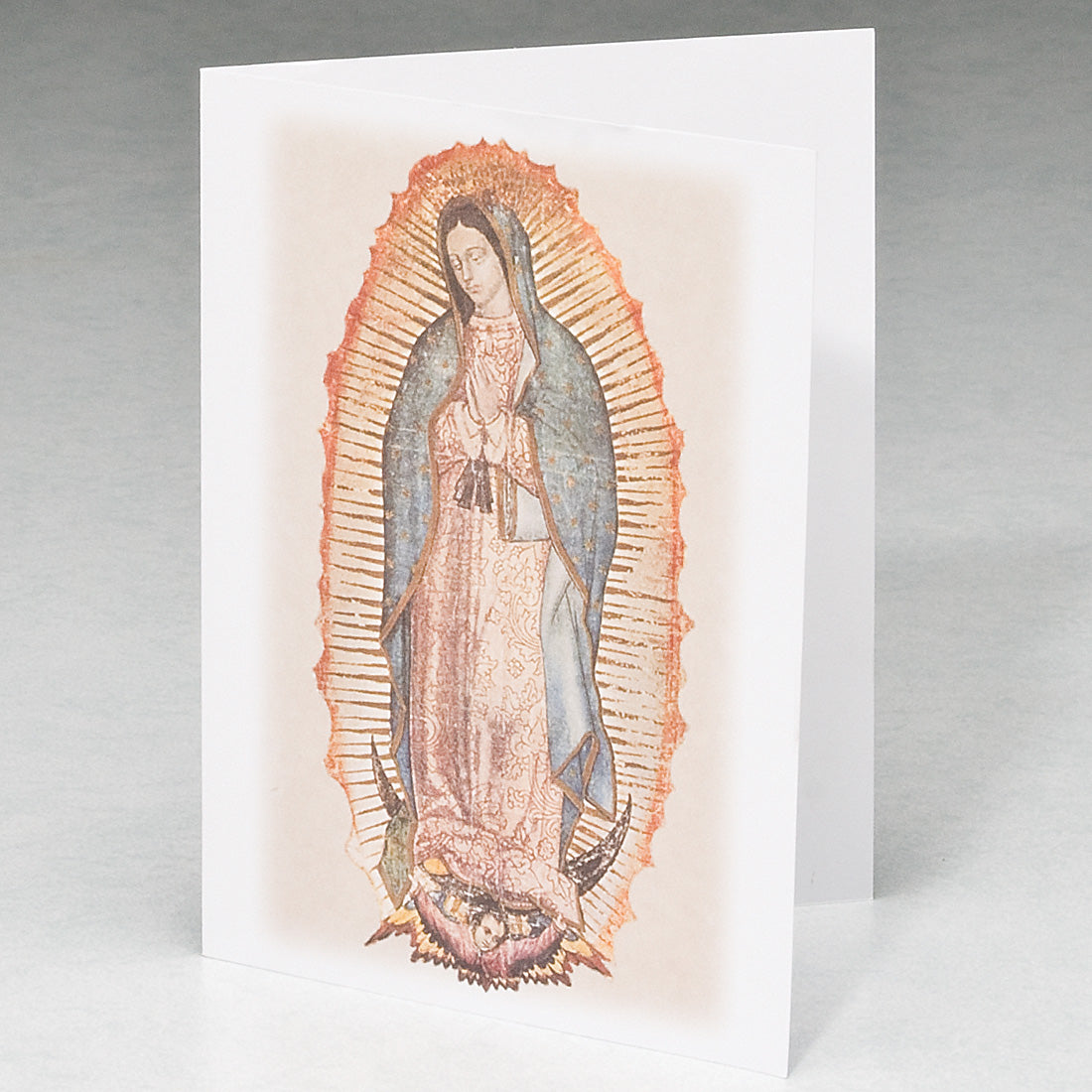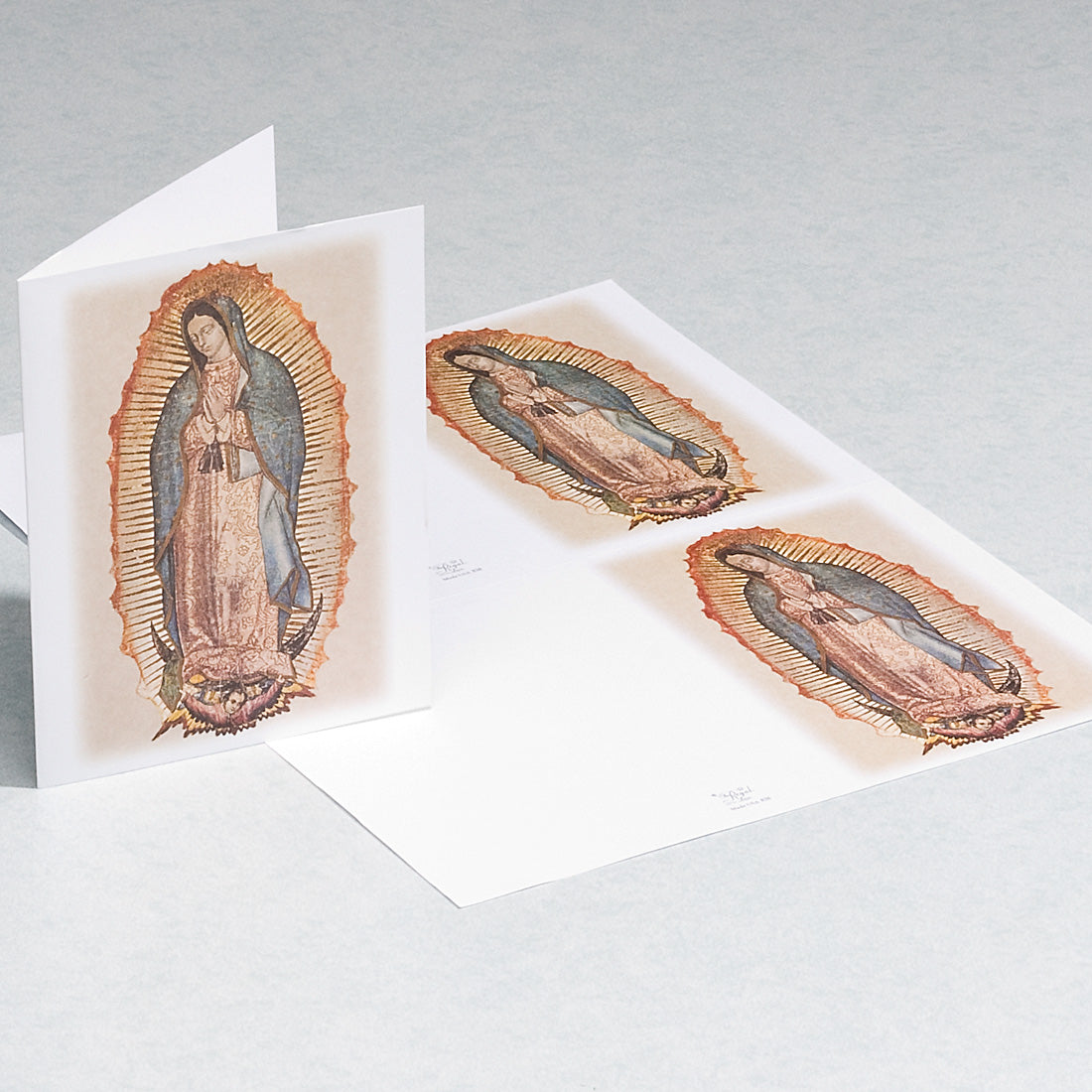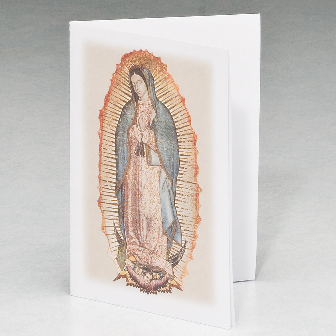 A beautiful four color series featuring Our Lady of Guadalupe. The acknowledgment card has “La familia de. siempre recordará con gratitud profunda su expresión de simpatía y consuelo" imprinted on page 3. The Jumbo service record has “23rd Psalm" in Spanish imprinted on page 2.