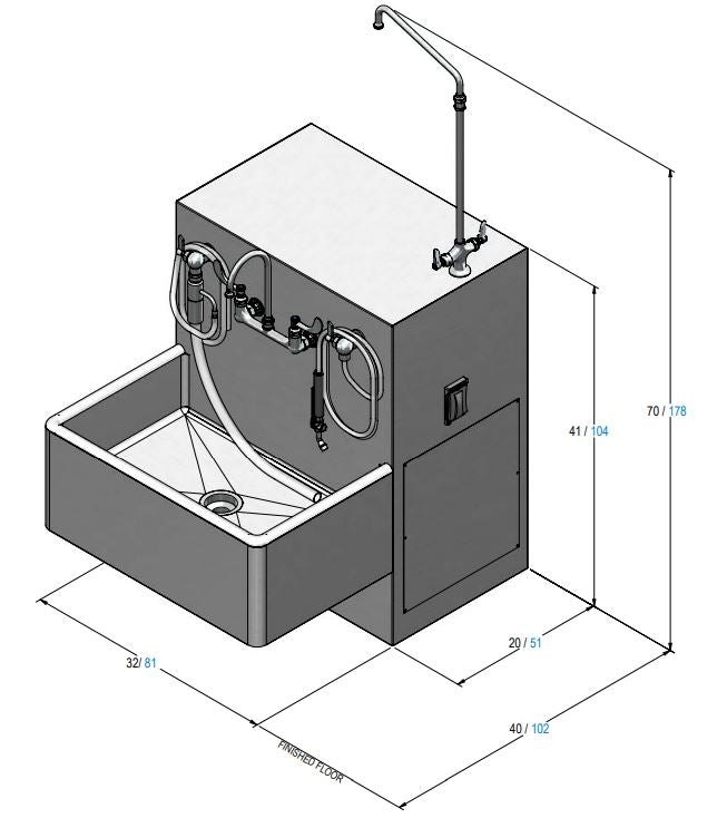 - Hot and cold water mixing faucet mounted on top deck with high spout for use with your embalming machine.