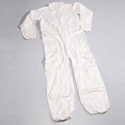 Non-woven, spun-bonded olefin. Disposable protective full body garment designed for high strength, flexibility, durability and superior wearer comfort. Features surged seams, zipper and elastic around wrists. Barrier qualities are geared towards airborne dry and splash particulates. Moisture-resistant. 1/ea.