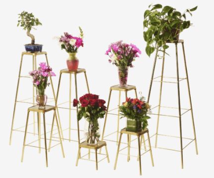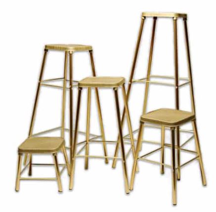 Gold-tone aluminum with non-rusting tops. Set includes stands of various heights that stack neatly upon on another for easy, compact storage.