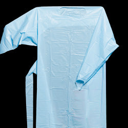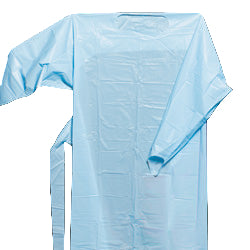 Disposable. Lightweight polyethylene. One-piece construction with single heat-sealed seam behind sleeve reduces potential for pass-through of fluids and other materials. Contoured thumb loops secure sleeves under glove for added protection. Opening for over-the-head fit and two ties at waist. Mid-shin length.