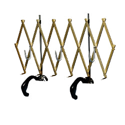 Designed to fit around the lid of either a half-couch or full-couch open casket. Black vinyl padded hooks protect casket surface and are adjustable for floral placement. Three floral hooks secure arrangements. Anodized gold-tone matt finish on aluminum. 50″ wide when fully expanded: collapses to 4″ width.