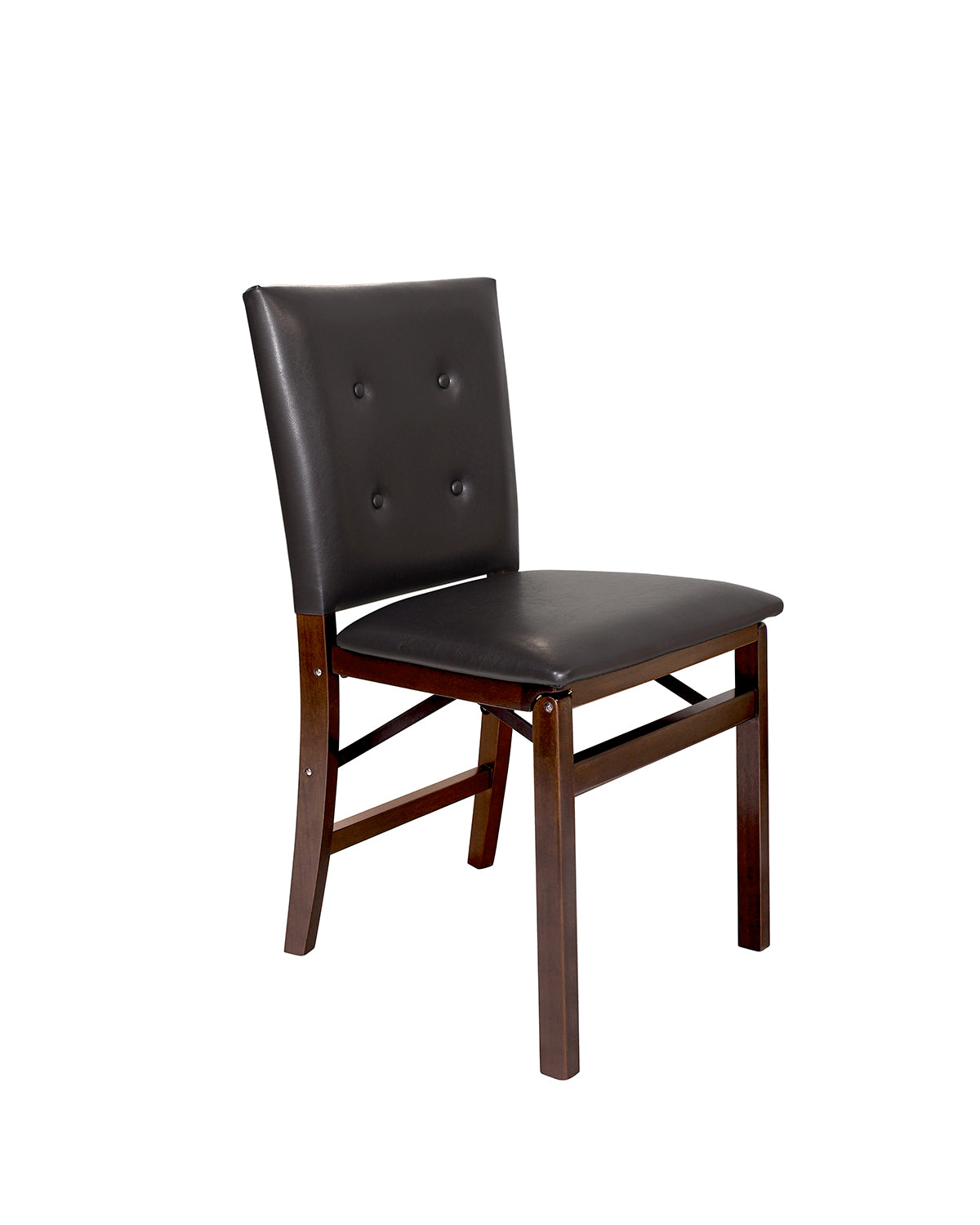 Designed with folding mechanisms for portability and compact storage. The Parson's chair folds to an approximate 6"-7" depth. Solid hardwood with glides, no assembly required. Wood chair with Espresso bonded leather or Jax fabric. Available in Espresso finish. 17.5"W x 33.875"H. Chairs are sold as sets of 2.