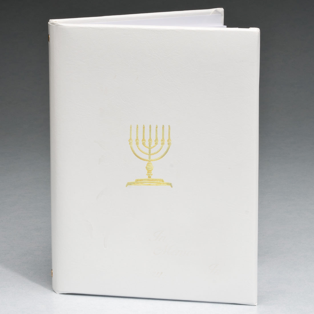 The gold foil embossed Register Book has a matching Acknowledgment Card that reads: “We shall always remember with deep gratitude your comforting expression of sympathy" on page 3 and Service Folder in black ink. Interior pages include: Dedication, Services, Memorial Days, Yahrzeit, Farewell!, Kaddish Prayer, The Mourner’s Kaddish, Yizkor Dates, Mourning Customs, Final Resting Place, Family Record, Biography, Newspaper Clippings, Register of Friends and the Information Fold Out, Printed in black on a natural parchment.