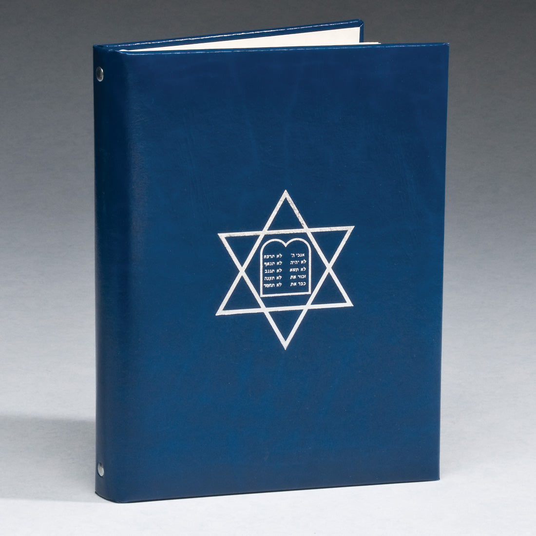 Stamped with silver foil and available in your choice of two different designs of Acknowledgments and Service Folders. Choose from the Star of David Series in gold ink or the four color Wailing Wall series. Interior pages of the register book are printed in black on a natural parchment-style stock. The Wailing Wall acknowledgment cards has “The family of.. acknowledges with deep appreciation your kind expression of sympathy" imprinted on page 3.