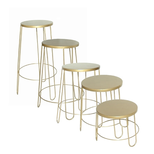 Gold epoxy powder coat, heavy gauge wire stand with flat metal steel plate top. Highly durable and rust resistance with proper care. Set includes stands of various heights that stack neatly upon on another for easy, compact storage.