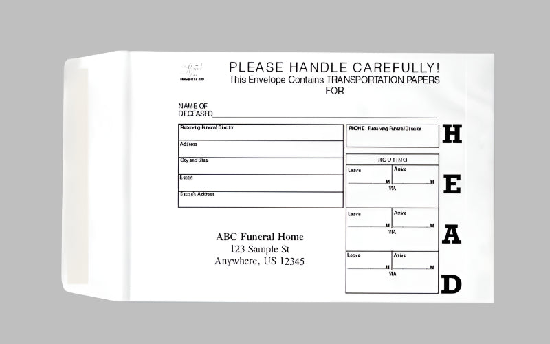 Sturdy envelope for transit papers. Spaces for routing. Fits airline shipping packs or wood cases. 5-line Funeral Director's imprint - included (call Customer Service to order with imprint).