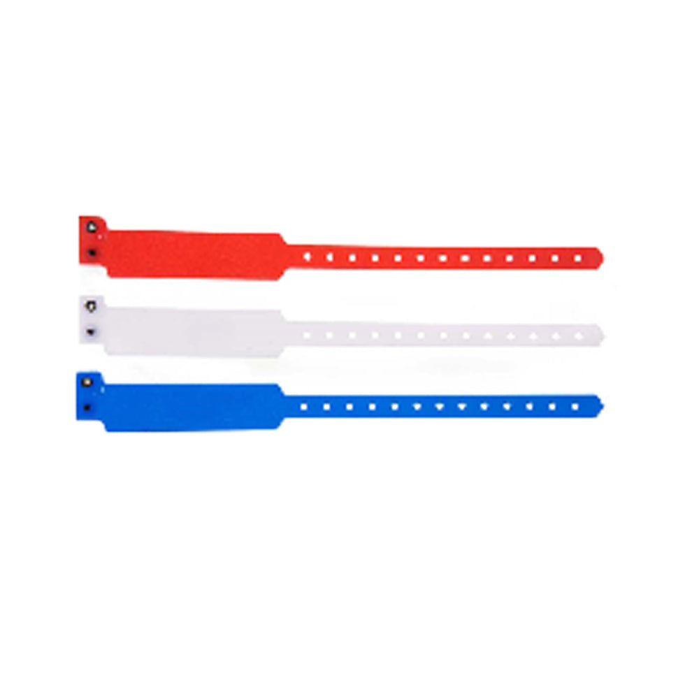 The Snap ID bands contain a water-resistant layer to maintain accurate identification information. Made of vinyl with a plastic snap, they are suitable for wearing on the wrist or ankle. Choose from 3 colors: Red, White, and Blue. Each box contains 500 bands.