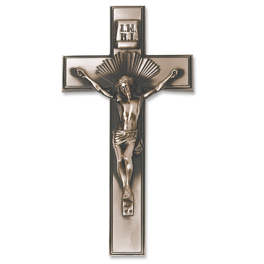 Enhance the elegance and sanctity of a casket with our Traditional Casket Crucifix. Expertly machine die-cast and electroplated, this crucifix is crafted for durability and aesthetic appeal. The curved back design ensures a perfect fit to the contours of the casket lid, providing a seamless and refined appearance. Easy to attach with pressure-sensitive tape, it is available in two timeless finishes: Bronze and Antique Silver. Each crucifix is individually boxed for protection and presentation. 10-3/4"H x 5-3/4"W