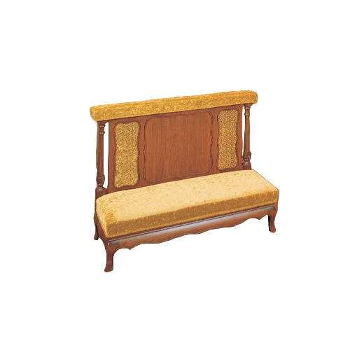 Detailed in French Provincial manner. Decorative grill work inserted over luxurious upholstery of your choice. Delicate hand carved frame with turned furniture legs. Thick foam padded upholstery on kneeler and handrail.